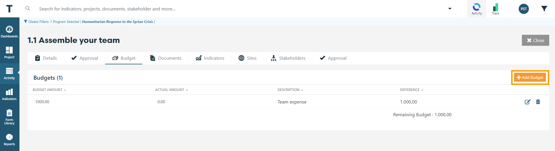Activity level Budget versus Actual (BvA) data can be tracked. It allows you to easily capture and adjust any under- or overspent budget at activity level.