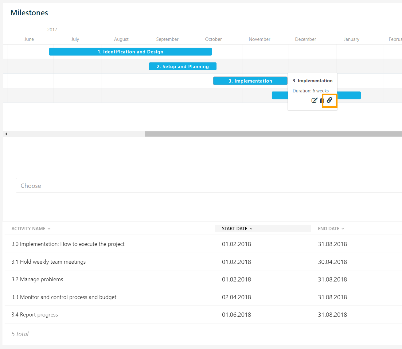 Quick Tip: Display activities linked to your milestone by clicking on the link icon on your selected milestone's pop-up window.