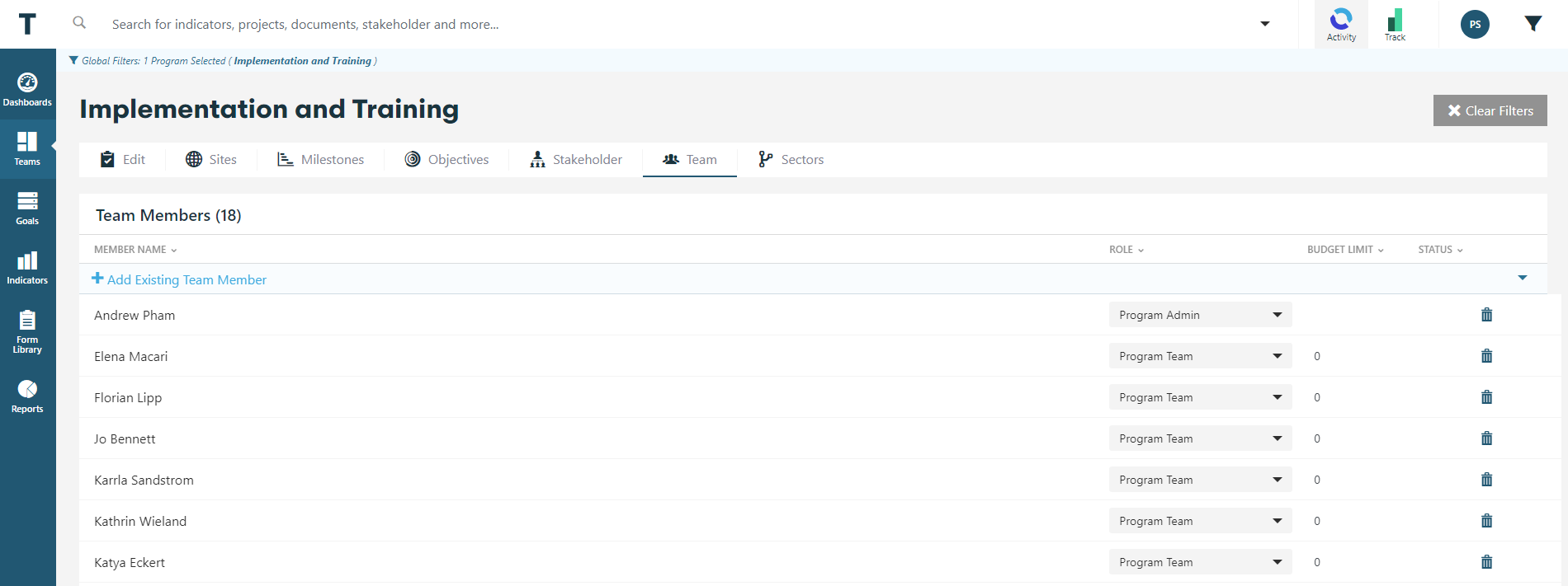 Team is everyone who works on a program or project and has access to it on TolaData as Program Admin, Program Team member or has View only permission.