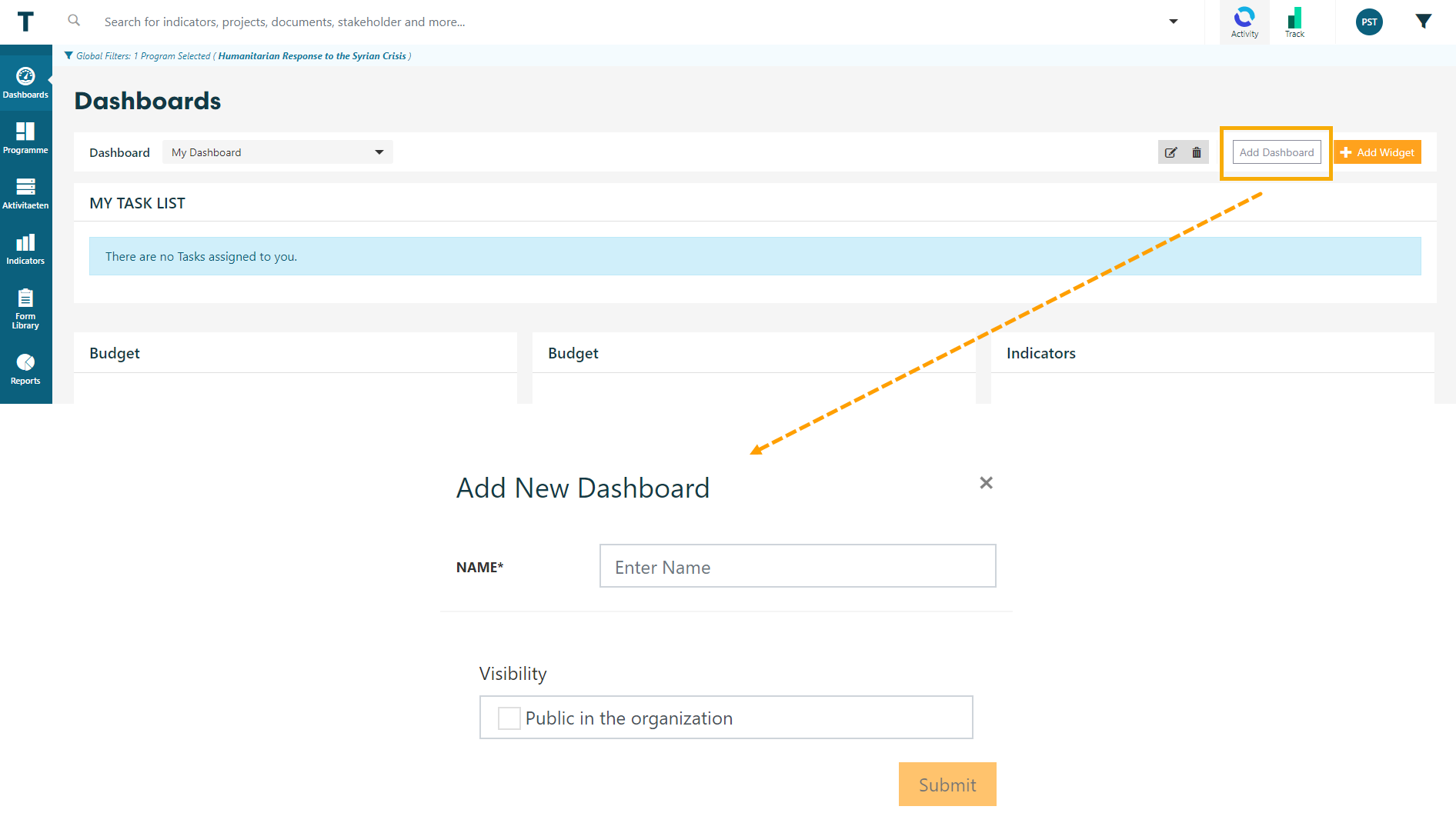 Dashboard is a custom report you can create yourself to get a quick understanding of the current status of selected aspects of your Program, Project/Activity, Indicator or other data point. Keep it to yourself or share across the organization (make it Public in the organization while creating a new dashboard or editing it). Dashboards are fully customizable, meaning you can create and adjust them to fit your current needs.