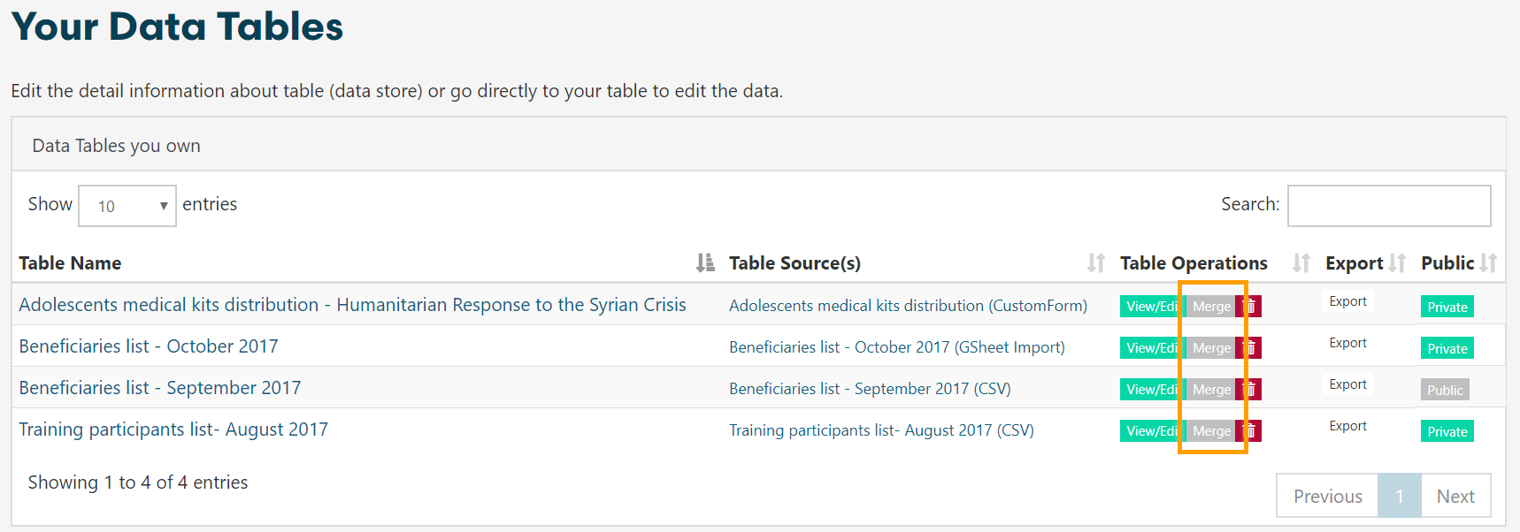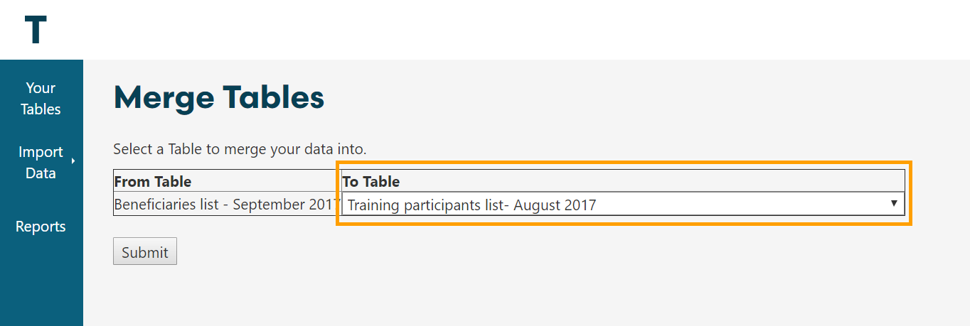 When Merging Tables the specified rows (e.g. User ID) in Table will be mapped across the two datasets and additional columns linked to each beneficiary/User ID will be added.