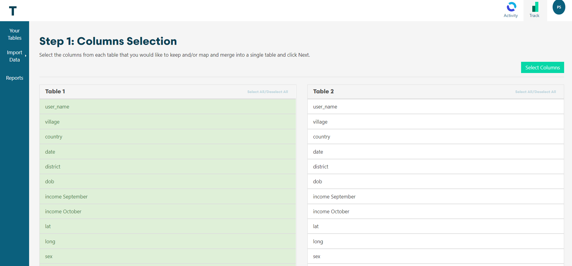 You can easily merge or append your Tables in Track. Let's see first, what's the difference.