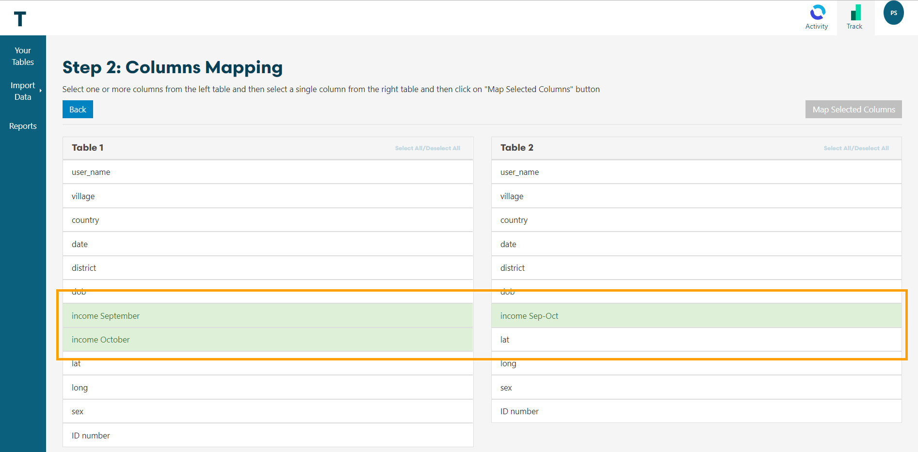 What if in one of your data tables eg. Name and Family name are in separate columns and in the other they sit in just one cell? You can easily put them together to follow the same scheme. Example columns: Income September and Income October can be mapped to Income Sep-Oct and summed! You can also calculate an average or simply join the two values, as you'd do with text input, like Name and Family name. You will see all available options after you hit Map Selected Columns.
