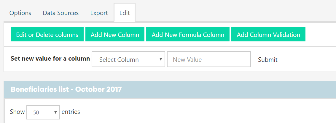 Once you've imported data you can then do basic edits on your data table, like for example change column names or create new columns with values dependent on your existing ones. You can also make sure that you'll find the expected information in your data columns (eg. are all my records in the 'Age' column integers?) by running column validation function.