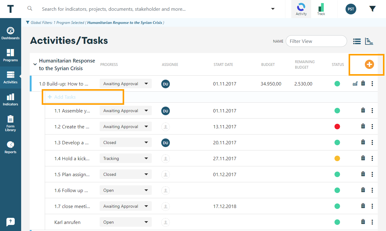 Next you might want to add activities to your program. Select the Activities tab on the Navigation bar and click on the orange + button or type your new activity directly in the + Add Tasks bar. Then, feel free to drag, drop and rearrange your tasks and activities as necessary.